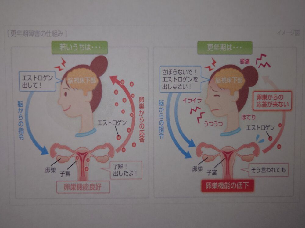 それで、人によっては、突然、運動もしていないのに汗がドーッと出てしまったり、風邪でもないのに微熱が続いたり、血圧が上がったり下がったりというような更年期障害特有の症状に至るわけです。