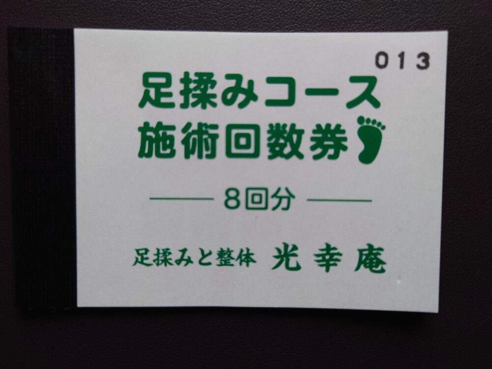 回数券の料金ですが、1回4,000円×8枚ですので、32,000円になります。足揉みコースは通常5,000円ですが、回数券ご購入のお客様には1回分1,000円引きの4,000円となりますのでお得だと思います。